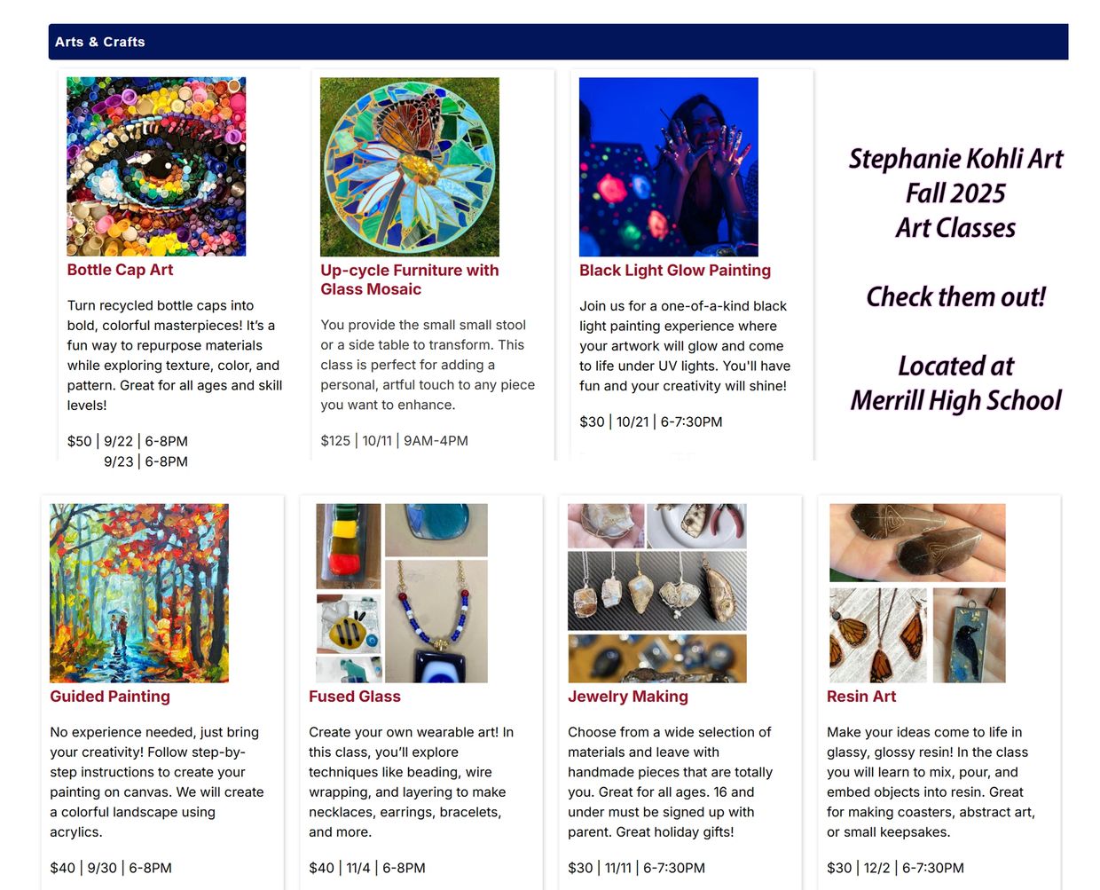 All classes are $30 per person (includes materials)
